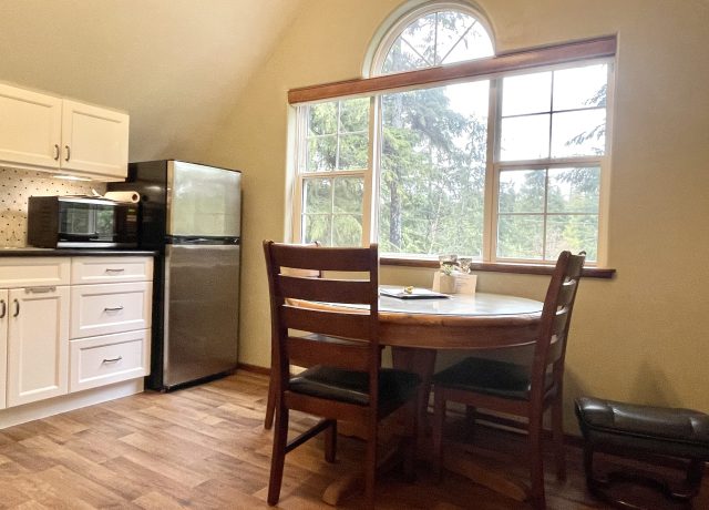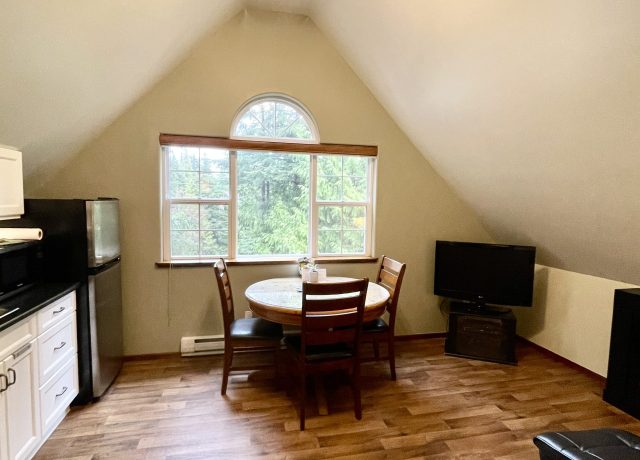 The Golden Dawn suite is equipped with a breakfast nook, full-size fridge, microwave, coffee maker, toaster, kettle, a 3-piece bathroom with bathtub/shower, a comfortable private living room with fireplace, and a flat-screen cable TV. The master bedroom has a queen sized bed (down comforter and all bed linens) and walk-in closet. Outside, relax on the beautiful cedar deck while viewing the occasional bird feasting at the bird feeder. Enjoy the outdoor BBQ, common picnic area, and fire-pit. Wireless internet connection (WiFi FREE) available. Located at 1115 Fellowship Dr.