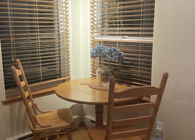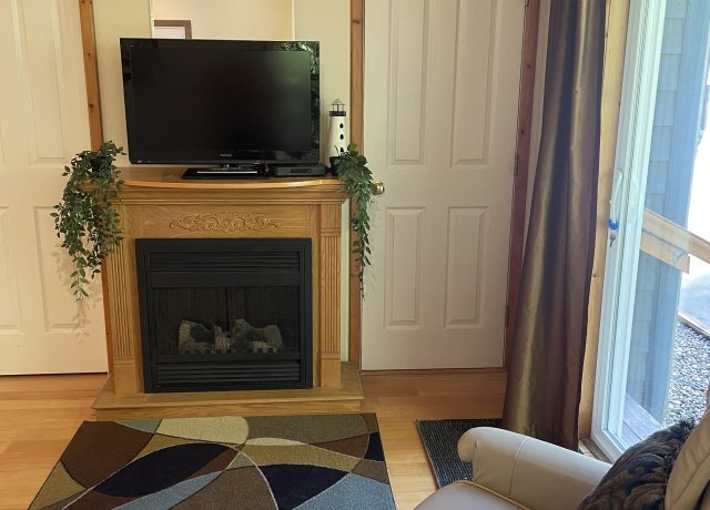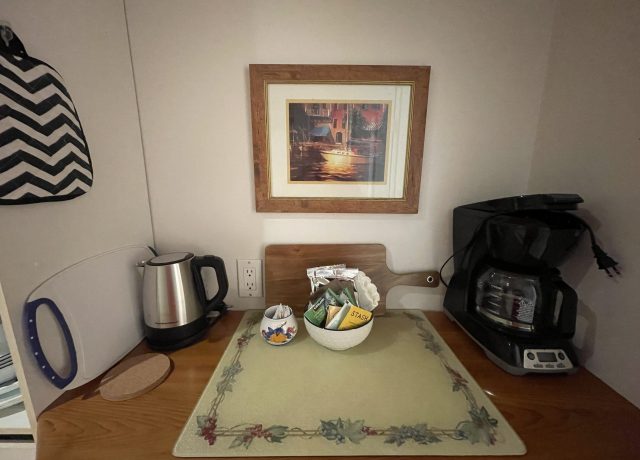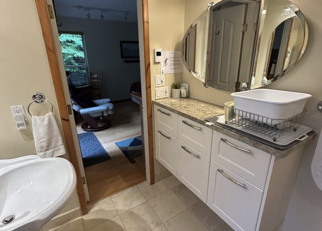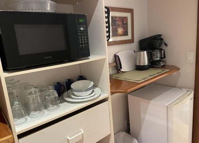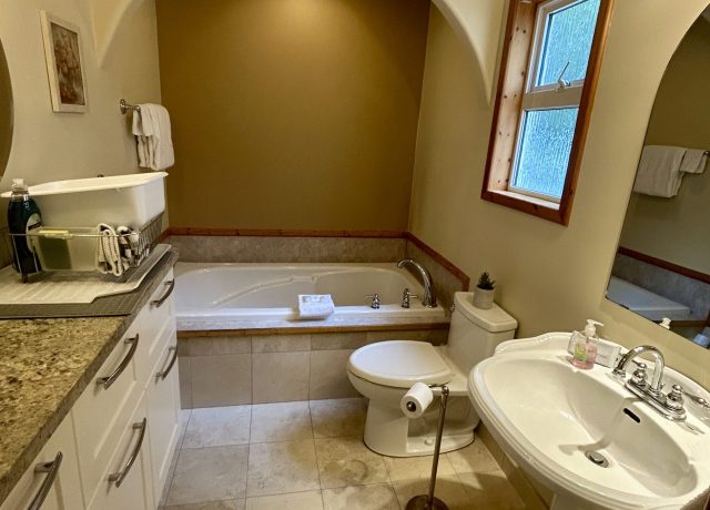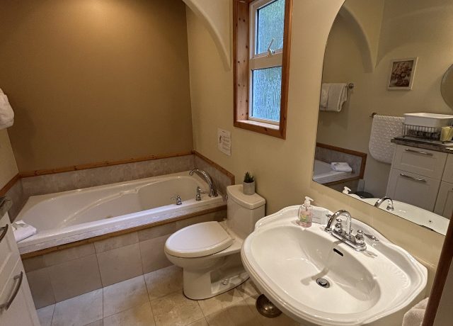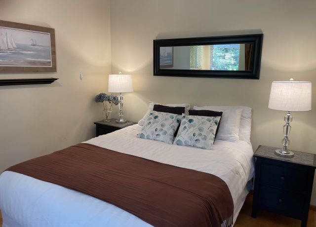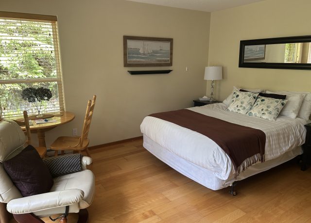 The Kingfisher” is a ground level, light-filled suite with private entrance and gorgeous natural private garden patio. Conveniences include a lovely breakfast nook, counter-high fridge, microwave, coffeemaker and kettle. Enjoy the inviting fireplace and flat-screen cable TV. The queen-size bed boasts a down comforter and crisp linens. The private bathroom soaker tub welcomes you as you relax after a day of adventures and fine or casual local dining.