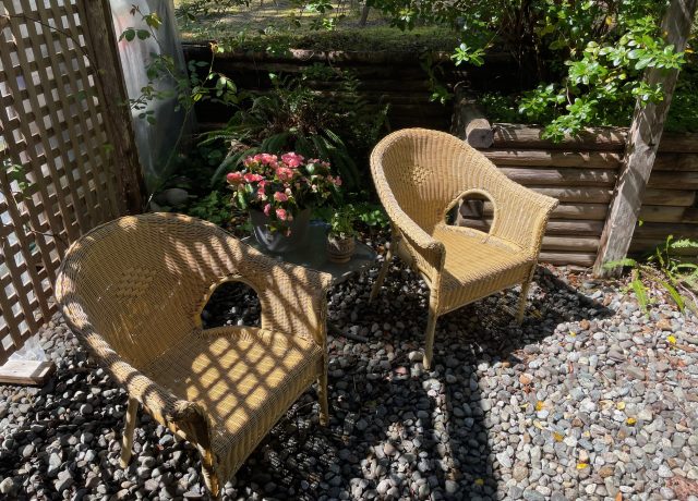 Outside, breathe in the fresh west-coast air while watching birds feast at the bird feeders. Sip your morning coffee, an evening glass of wine, or hot chocolate while you lounge in your private patio or in one of the other common areas nestled among the trees on property. Also, you may cook your catch of the day on an outdoor BBQ, eat outdoors in a common picnic area, or roast marshmallows around a crackling fire in the firepit.